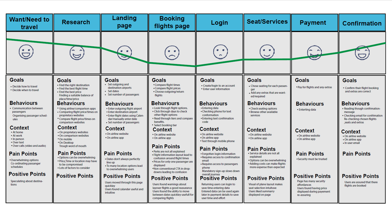 The first step is the research process. My goal was to design the UX for an airline booking website as part of my studies at the UX design institute. For my research I went through several steps.
